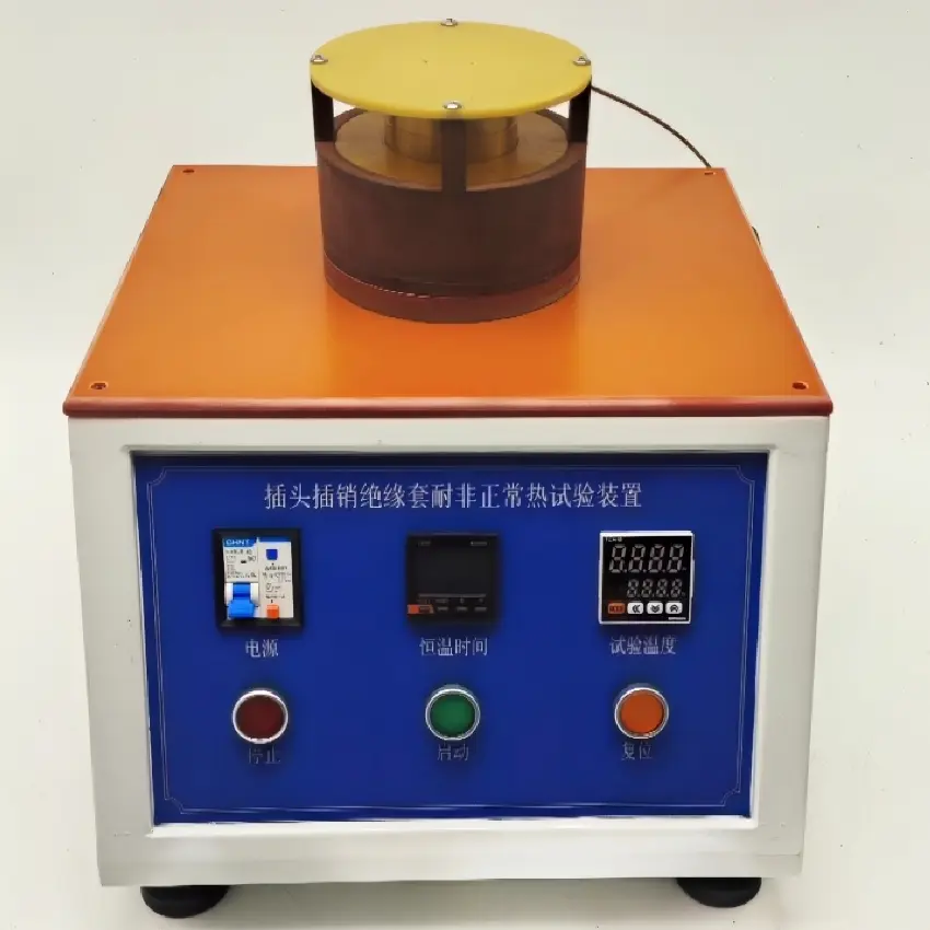 本装置符合GB2099-2021第28.1.3条及图40、IEC60884-1图40标准要求,适用于对插销有绝缘套的插头进行耐非正常热和耐燃测试,模拟可能受电热应力且劣化会损害插接装置安全性能的绝缘部件,不得因暴露在过热和火焰下而受到过度损坏。