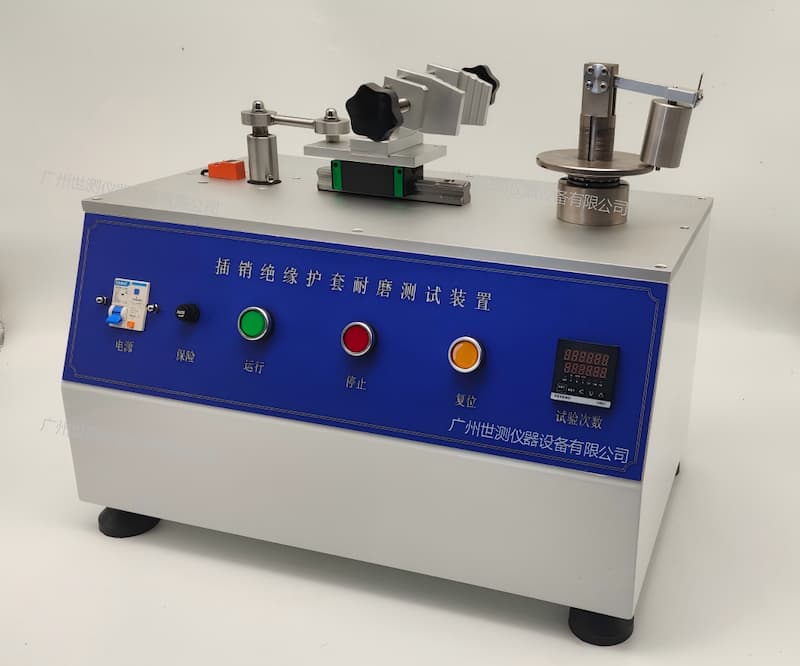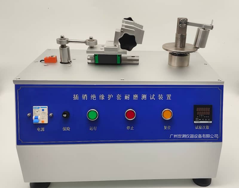 试样范围:插头插销绝缘护套结构及功能:由一个水平放置的横梁和线性运动的夹具座组成,横梁末端装有直径为1mm的短钢丝弯成的U字形头(U字形的两个点垂直固定在横梁上),钢丝U型底边为6mm直线工作部分。将U型钢丝6mm直线底边压在插销绝缘套上,电机带动安装有插销的夹具座做前后往复运动,从而钢丝与插销绝缘试样摩擦进行试验。